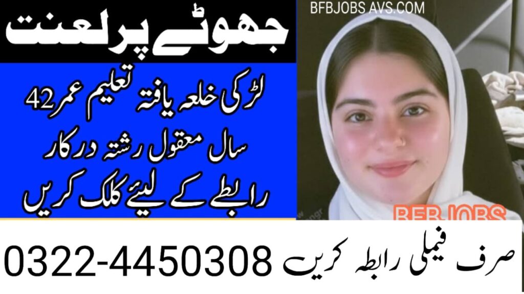 2. میری عمر46سال ہیں اور دوسری شادی کرنا چاہتا ہوں میری پہلی بیوی فوت ہو گئی ہیں اور میں فیصل آباد کے گاوں میں گھر رہائش زمین اپنی ھے پاکستان ائیرفودس لاھور میں نوکری کرتا ھوں میری کاسٹ وسیر جٹ اور رابطہ نمبر یہ ہے 03218029374
