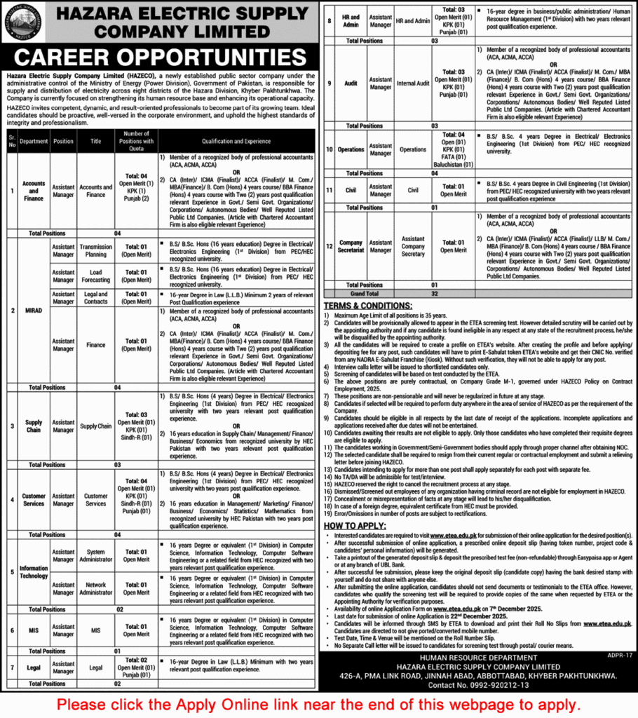 Looking for a stable and rewarding career in Pakistan’s dynamic energy sector? Your search might just end here! This December 2025, the Hazara Electric Supply Company (HAZECO), under the WAPDA umbrella, is lighting the way for talented professionals. They have announced fantastic career openings, specifically for the roles of Statistical Officer and Assistant Manager.