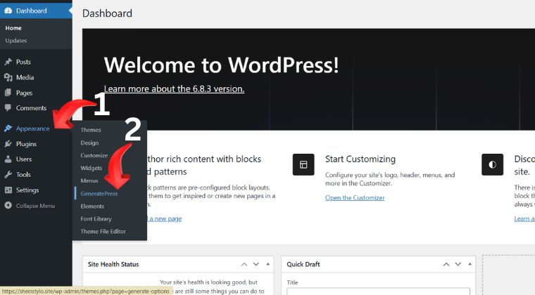 To insert GeneratePress starter site templates, you first need to log in to your WordPress admin dashboard. Once logged in, navigate to the left-hand side menu and hover your cursor over Appearance. A submenu will appear—within it, you’ll see the GeneratePress option. Click on it, as shown in the image below.