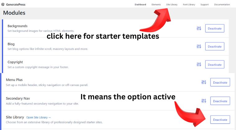 Once you’re on the dashboard, make sure to verify that the “Site Library” module is activated. If this module is not active, you won’t be able to see the Site Library option.